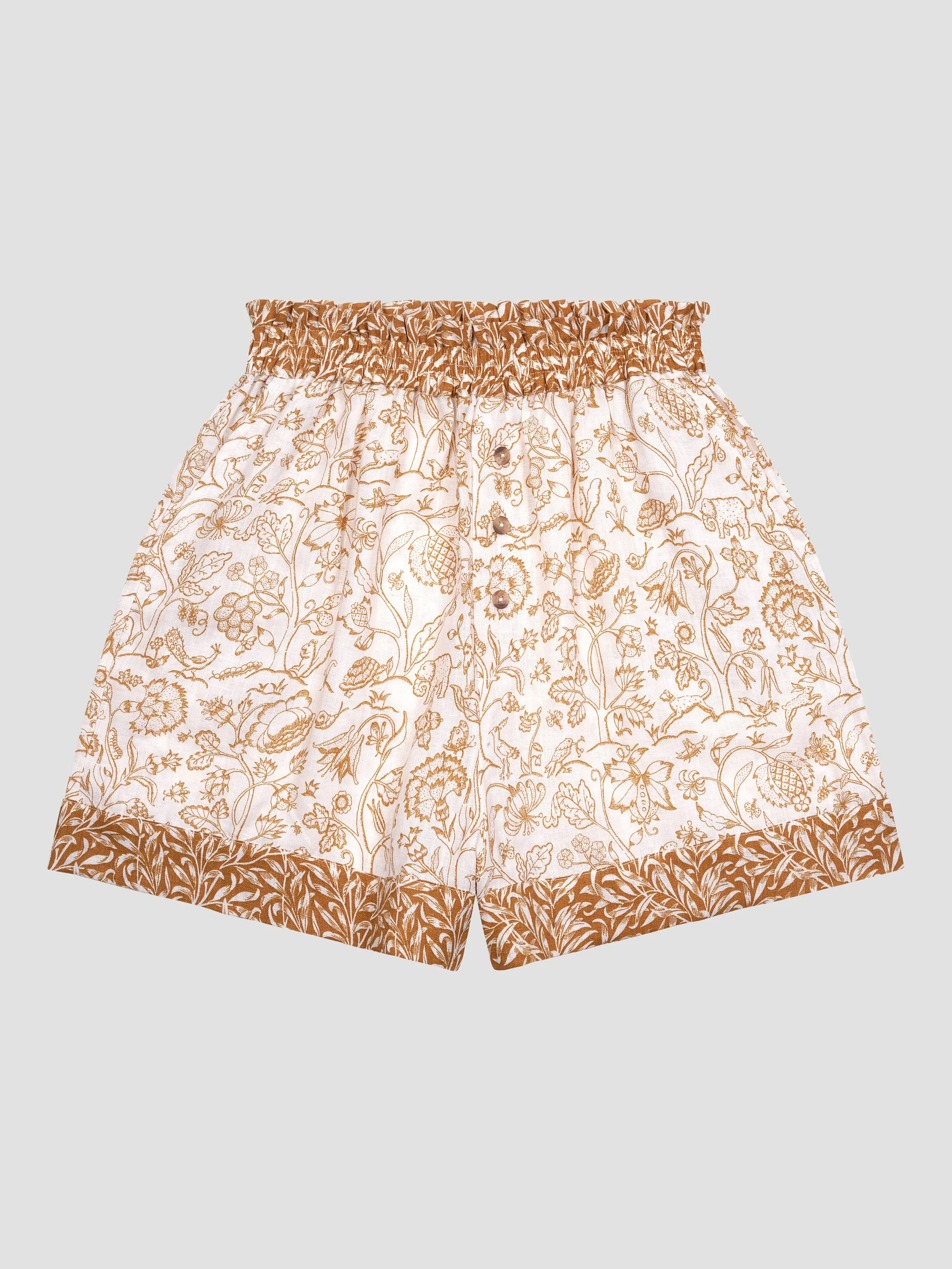 Designed in collaboration with Morris & Co., our Ernest White linen women’s pajama shorts set features the whimsical Middlemore pattern inspired by a quilt embroidery created by May Morris in 1889. Featuring delicately drawn flora and fauna, the classic motif pays homage to the brand’s rich heritage while faithfully reimagining it for modern living.