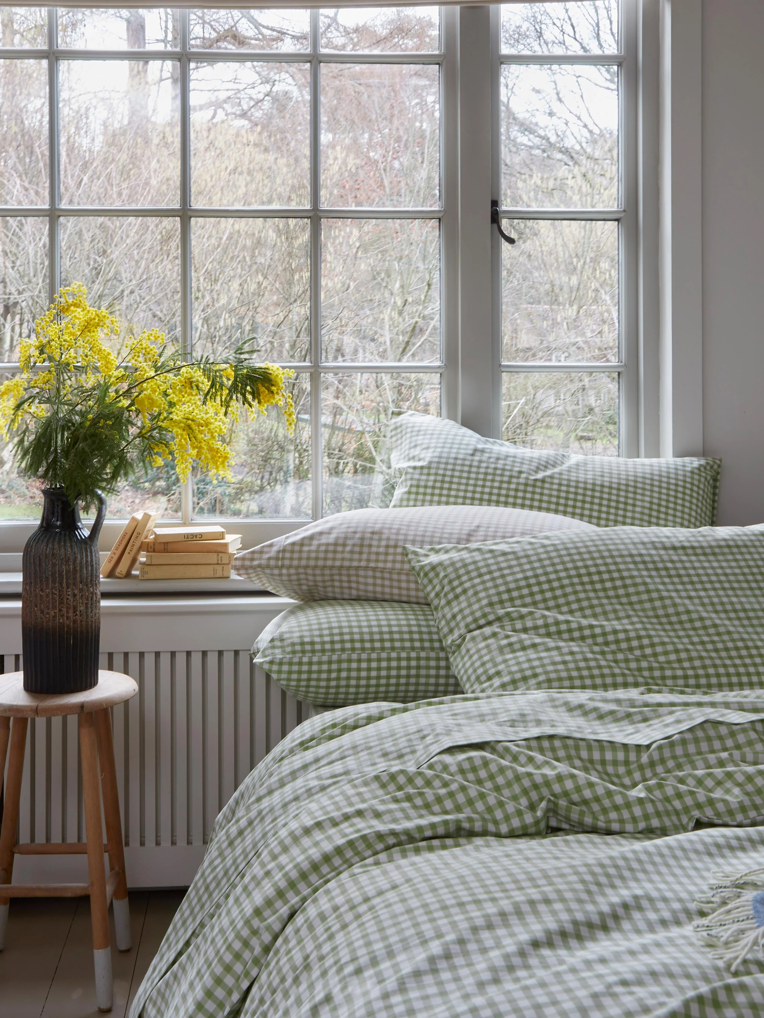 Our most-loved print: Gingham, is now available in crisp percale cotton. Made in Portugal from 100% cotton, our cotton gingham pillowcases will add a country-inspired feel to your bedroom. The percale weave allows for a matte finish, high breathability and relaxed look - perfect for lovers of high quality cotton bedding. Curate a unique bedtime look, sentimental to you and mix and match to your heart's content. Our Pear gingham cotton range adds a touch of timeless charm as a mono-print ensemble, but pairs beautifully with plain washed cotton colors: White, Parchment or Pear.