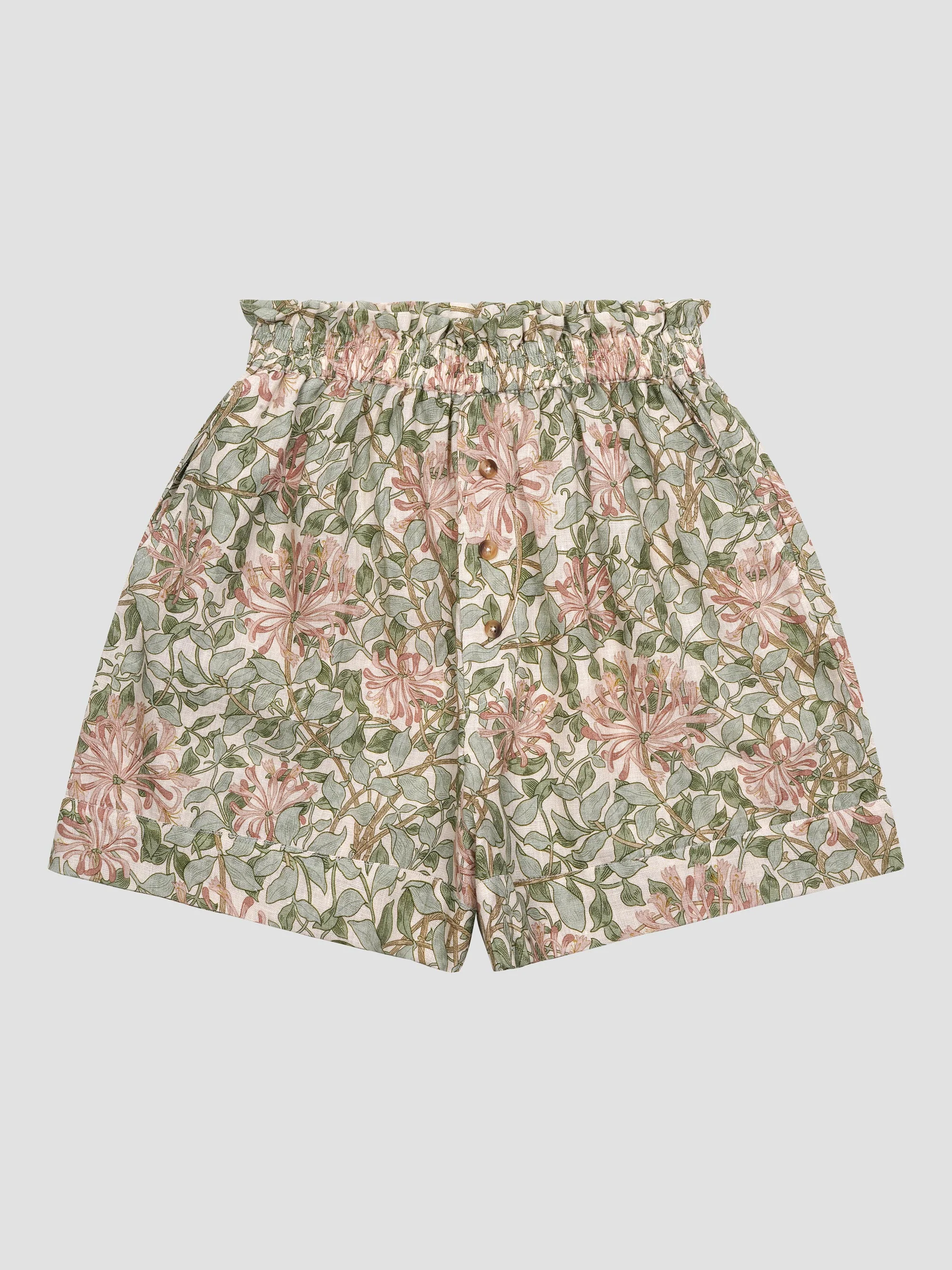 Designed in collaboration with Morris & Co., our Soft Sage linen women’s pajama shorts set features the iconic Honeysuckle pattern created by May Morris in 1883. With its climbing stems and clusters of delicate blooms, the classic motif pays homage to the brand’s rich heritage while faithfully reimagining it for modern living.