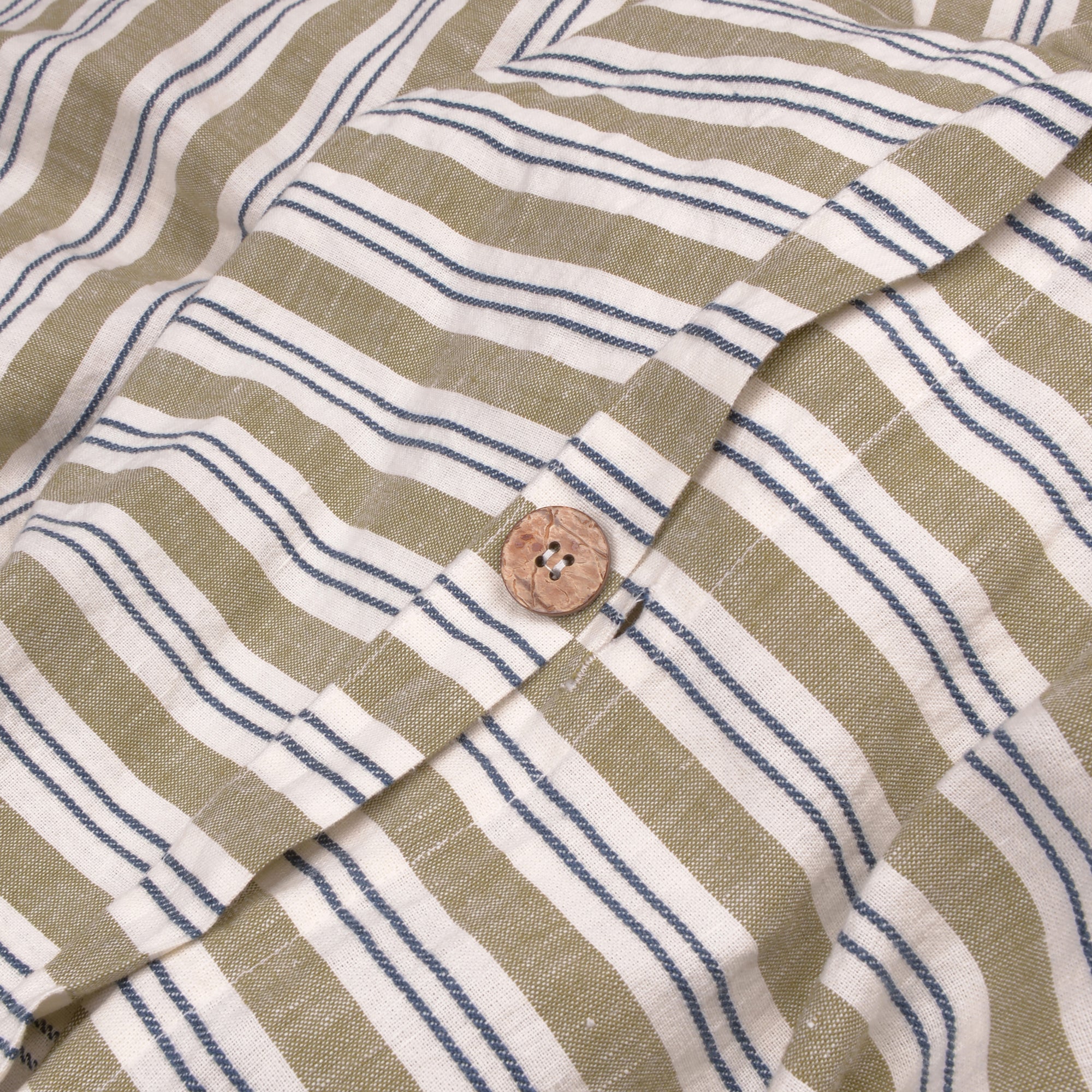 Our heritage-inspired Thyme Somerley stripe duvet cover features a classic warm green stripe interspersed with a patterned dobby weave for extra dimension. Made from a blend of European linen and cotton, this wonderfully breathable, comfortable and durable fabric offers the best of both worlds. This duvet cover features coconut shell button fastenings and handy inside corner ties to stop your duvet from slipping.